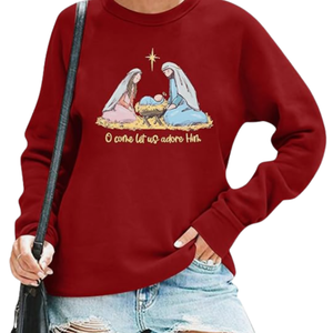Christian Christmas Sweatshirts Cozy Christian Christmas sweatshirt featuring a festive church graphic and “Oh come let us adore him” message....