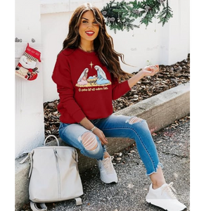 Cozy Christian Christmas sweatshirt featuring a festive church graphic and “Oh come let us adore him” message. Crafted from a soft cotton-poly blend, this warm holiday crewneck is perfect for church events, family gatherings, and everyday winter wear.